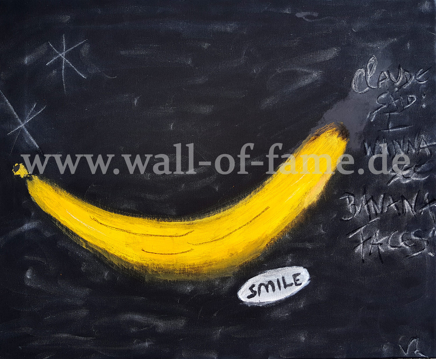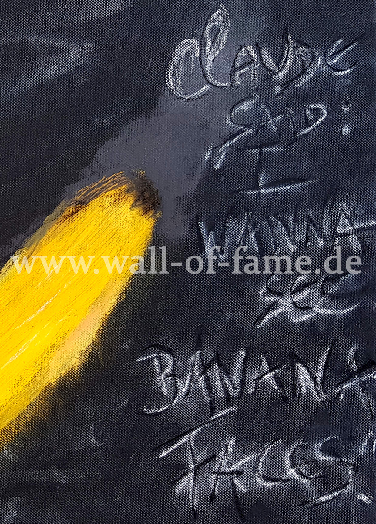 Original oil painting “Banana Smile” by Krokus bassist Chris von Rohr. He requotes famous Montreux Jazzfest promoter Claude Nobs, who invited the audience: “I Wanna See Banana Faces”, 60 x 50 cm. EUR 2900,-