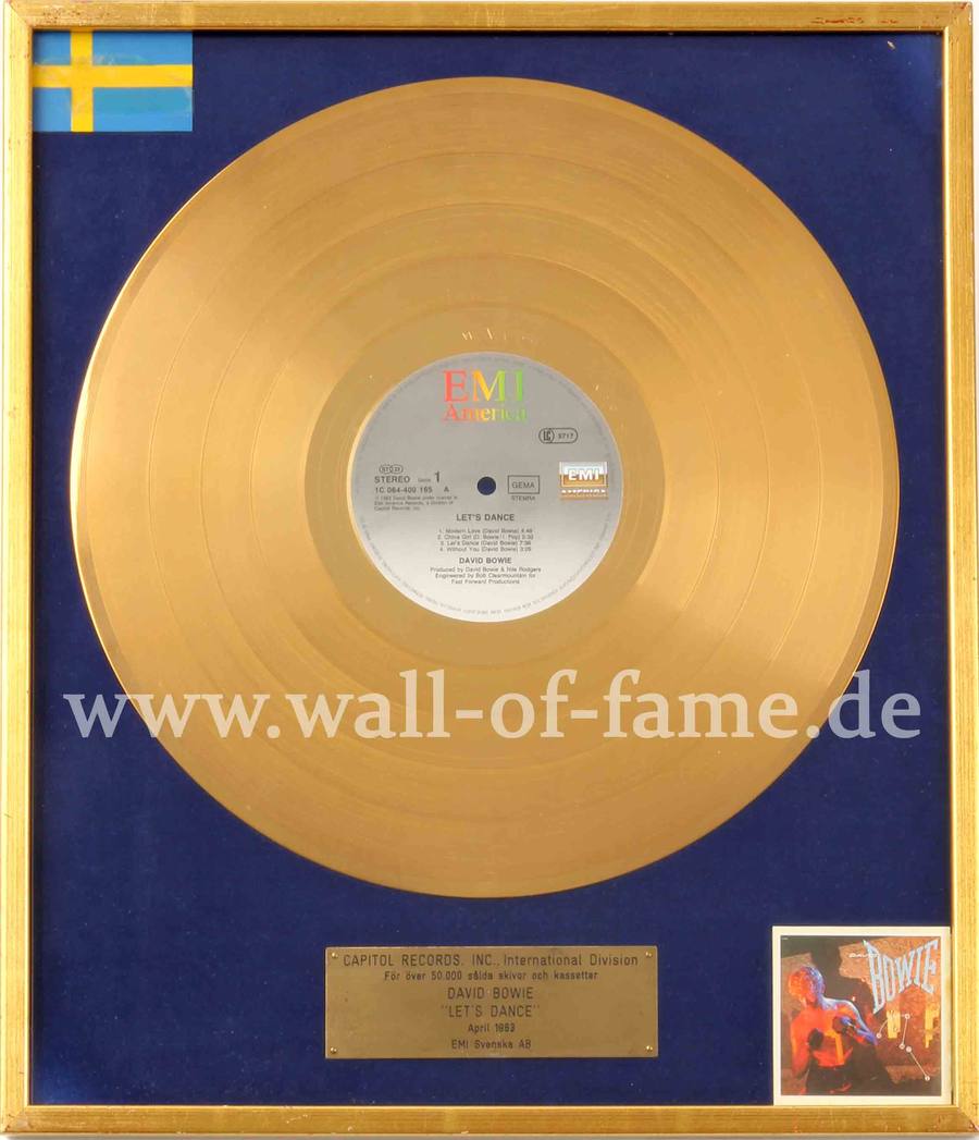 “Gold” record award presented to Capitol Records to commemorate the sale of over 50,000 units of the EMI Records album Let’s Dance in Sweden, EUR 1250,-