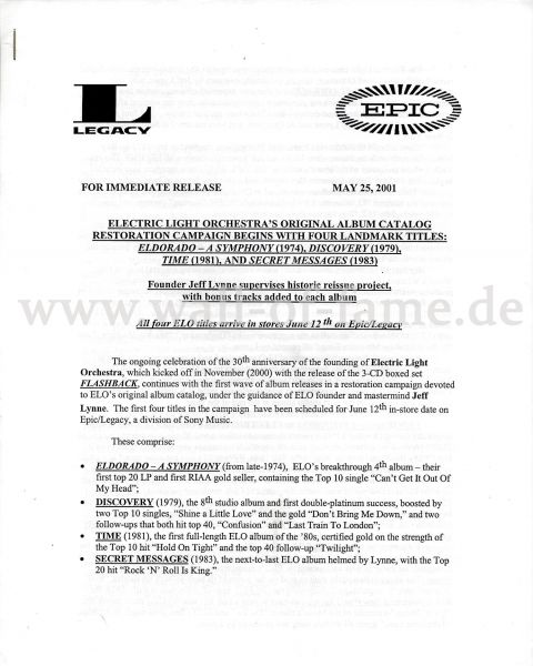 Original presskit for the CD remaster campaign of ELO. EUR 75,-