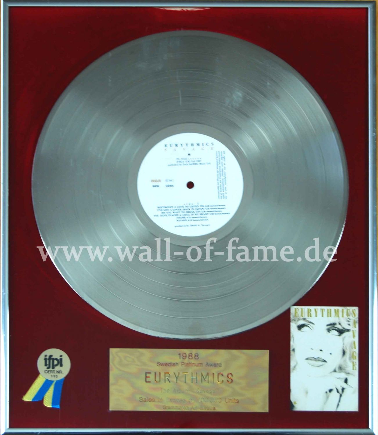 Platinum record award for sales in excess of 100.000 units of the RCA album Savage in Sweden, EUR 625,-