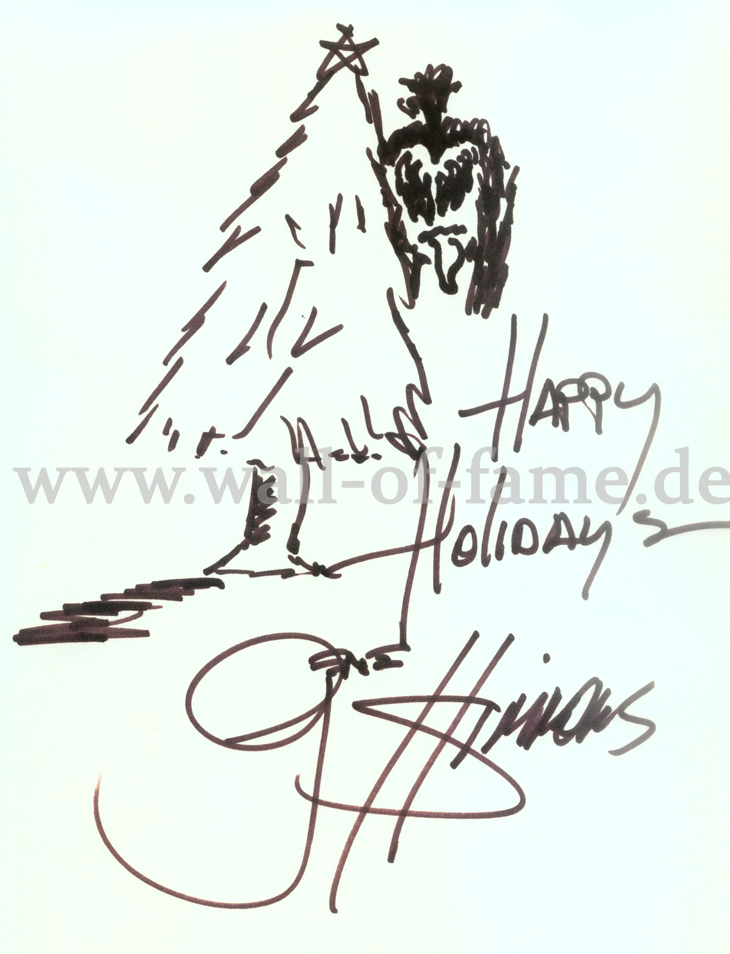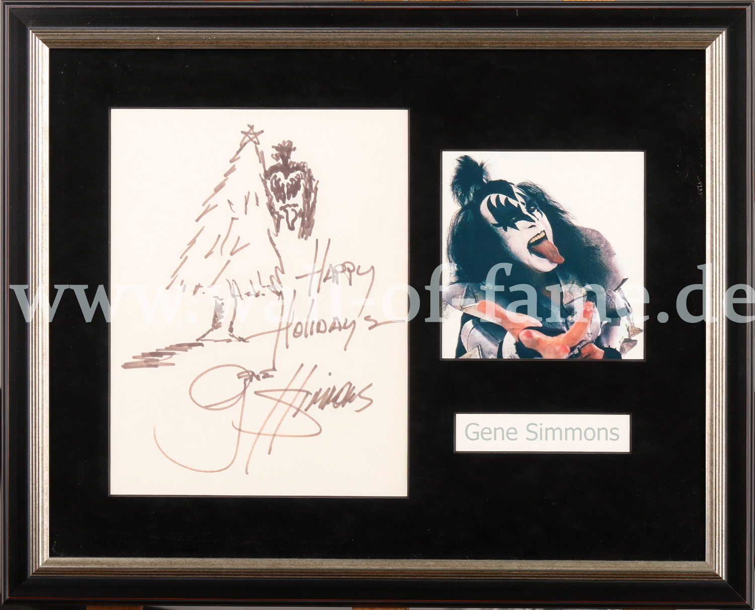 Christmas greetings from Gene Simmons to his fans. Handdrawn christmas tree w/self portrait reading “Happy Holidays, Gene Simmons”, 53 x 47 cm, signed and framed, EUR 790,-