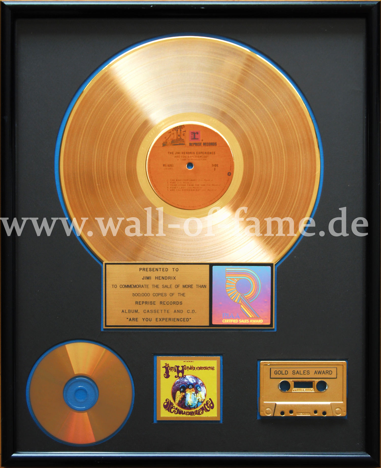 An RIAA “gold” record award presented to Jimi Hendrix to commemorate the sale of more than 500,000 copies of the Reprise Records album Are You Experienced in the United States EUR 2150,-
