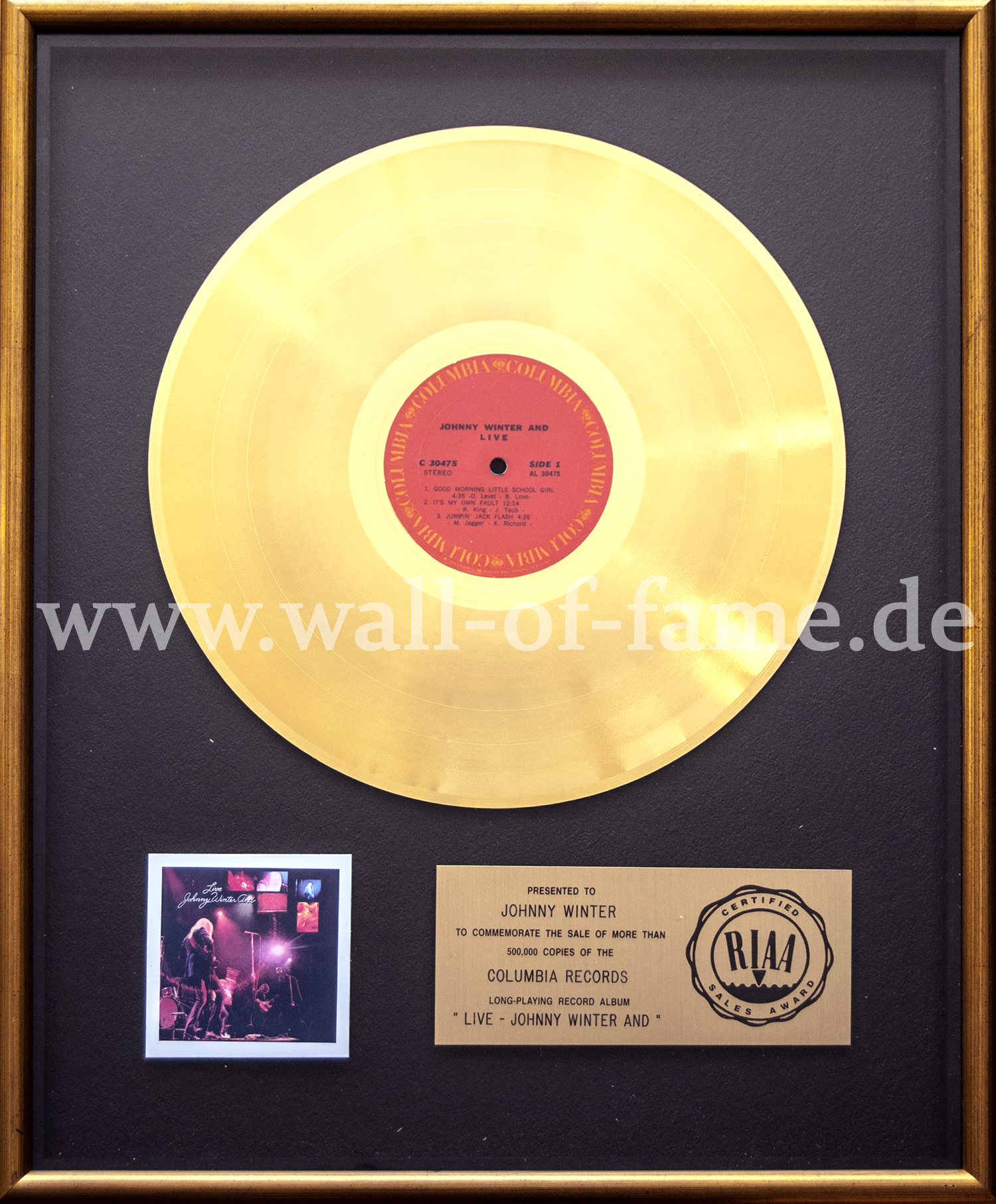 RIAA gold award presented to Johnny Winter for the sale of more than 500.000 copies of the Columbia Records album Live – Johnny Winter And in the USA, rare award of legendary guitarrist Johnny Winter, EUR 1450,-