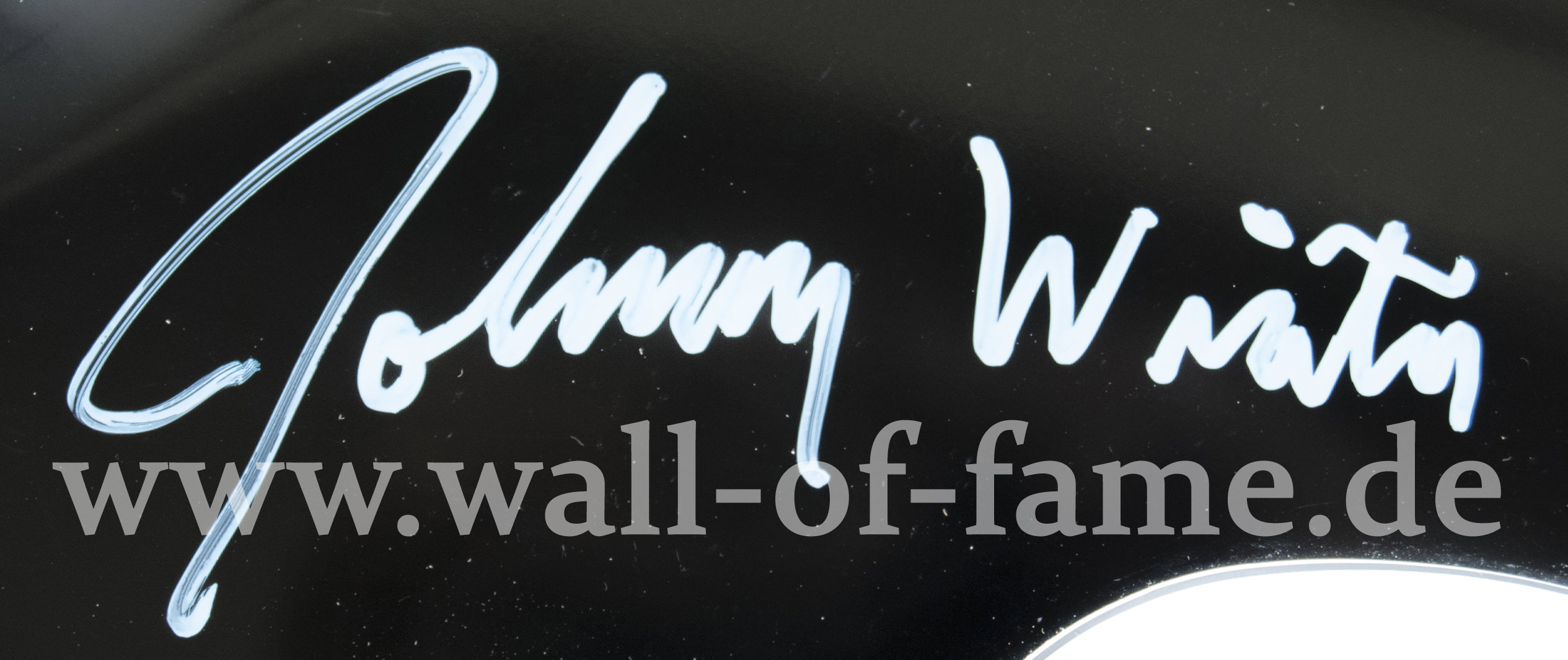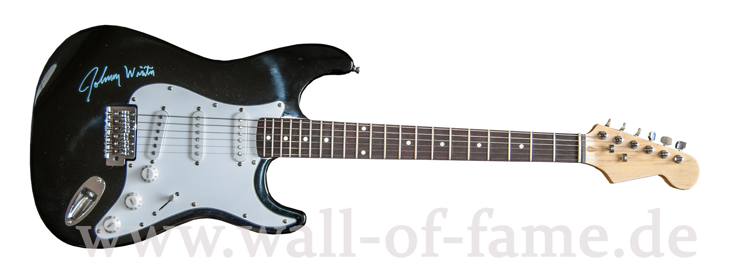 Black Fender Stratocaster style guitar signed with silver marker pen by legendary blues guitarist Johnny Winter. From one of the world´s most famous autograph collections, EUR 1150,-