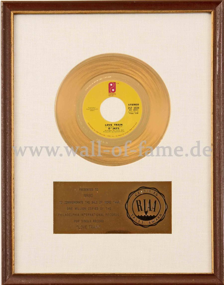 An RIAA “gold” record award presented to WRBD to commemorate the sale of more than 1 million copies of the Philadelphia International Records single Love Train in the United States EUR 750,-