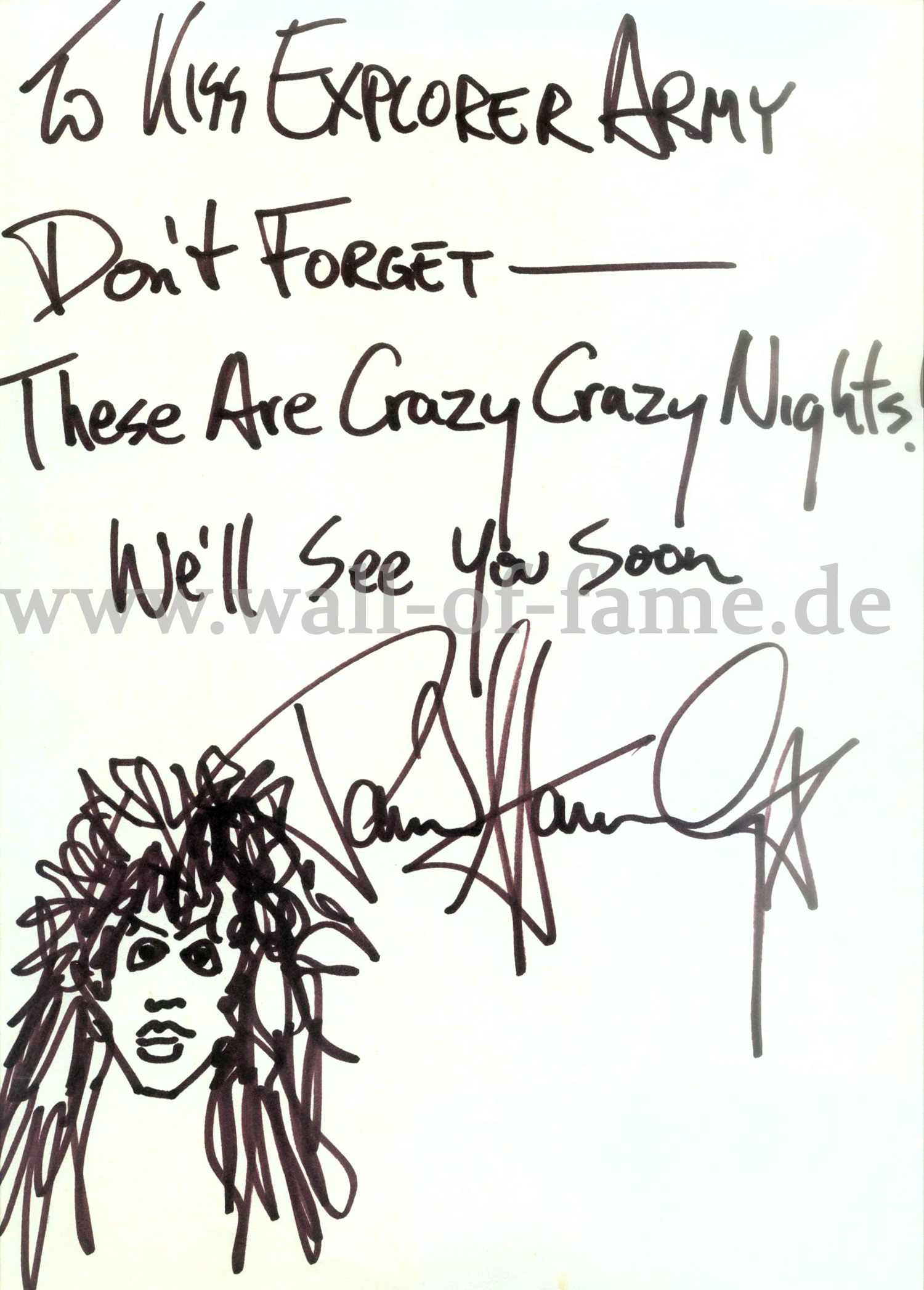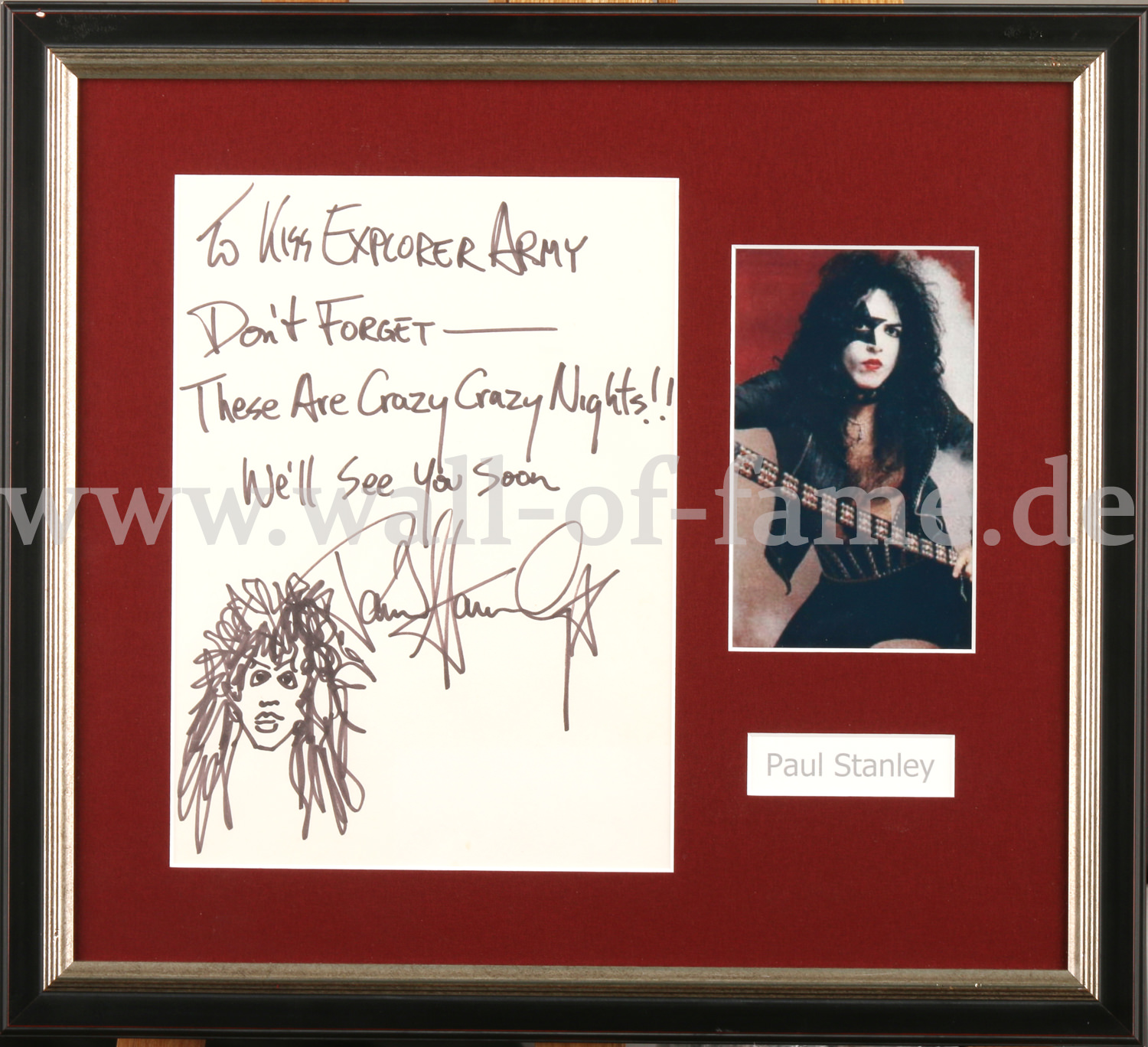 Letter to Kiss fans – “Don´t Forget These Are Crazy Crazy Nights, Paul Stanley” – signed with self-portrait drawing, 52 x 48 cm. EUR 890,-