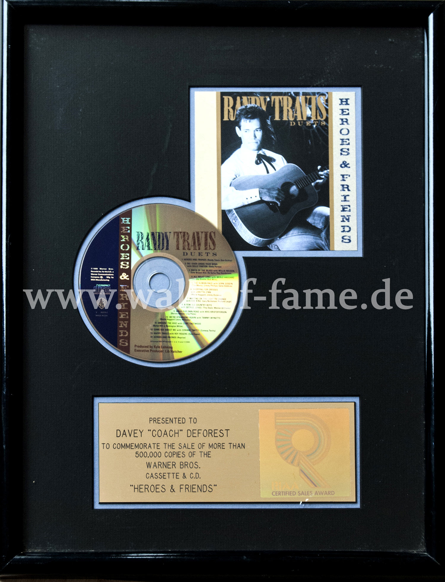 An RIAA “gold” record award, presented to Davey “Coach” Deforest to commemorate the sale of more than 500.000 CD´s of the Warner Bros. Records cassette and CD Heroes & Friends in the United States EUR 130,-