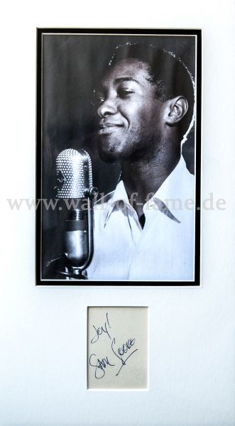 Rare autograph of Sam Cooke w/blue biro. Mounted with matte and photo. 28 x 51 cm. EUR 850,-