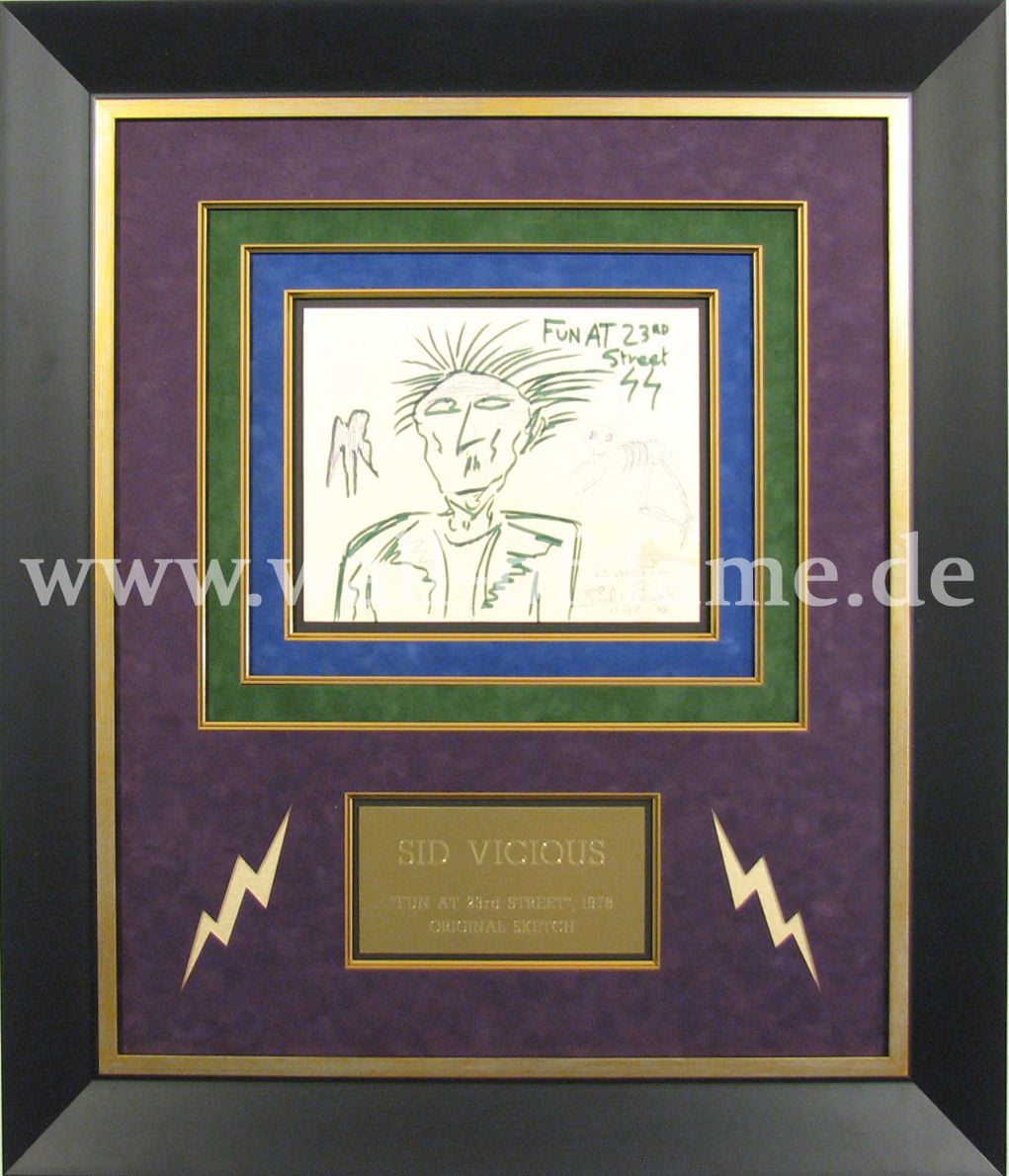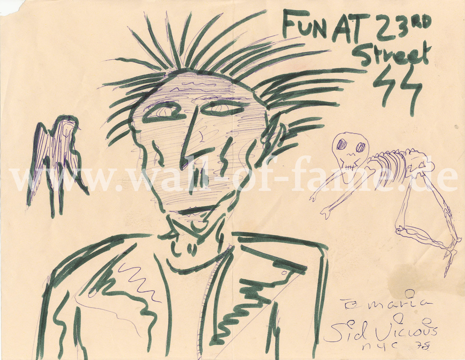 Iconic punk legend Sid Vicious made this feltpen/biro drawing in 1978 in New York, dedicated “To Maria, Sid Vicious NYC 78”. A4 size, framed, EUR 7900,-