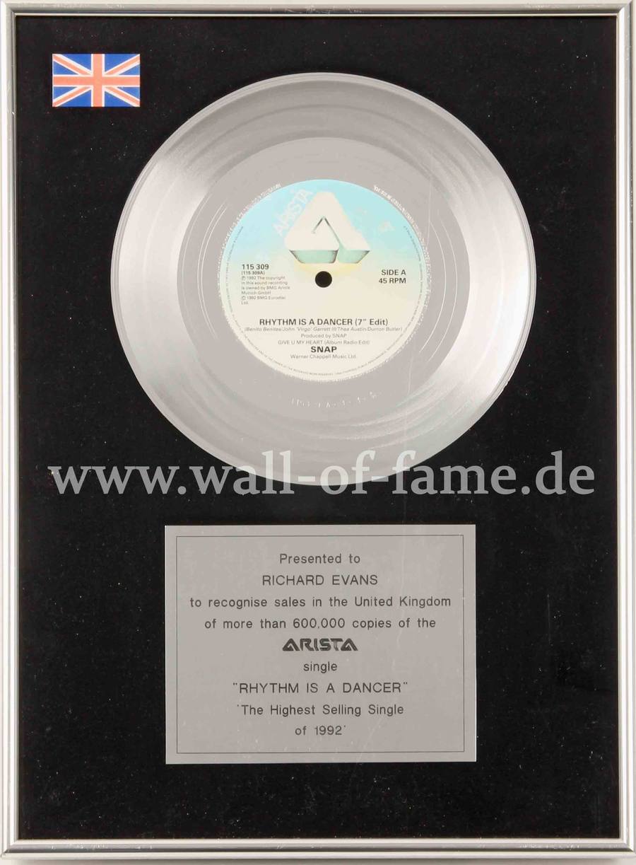 An In-House “Platinum” record award presented to Richard Evans to recognize the sale of more than 600.000 units of the Arista single Rhythm Is A Dancer in the United Kingdom, EUR 450,-