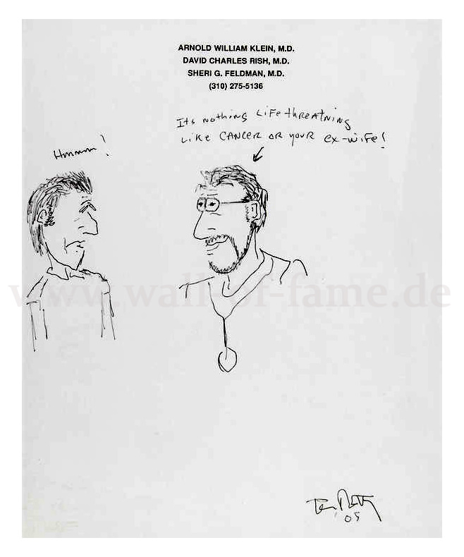 Pen and ink drawing, signed and dated, 2005, on Dr. Klein’s letterhead. Petty stands with the doctor, conversing: “Its nothing life threatening like cancer or your ex-wife!”, 38x33cm EUR 4800,-