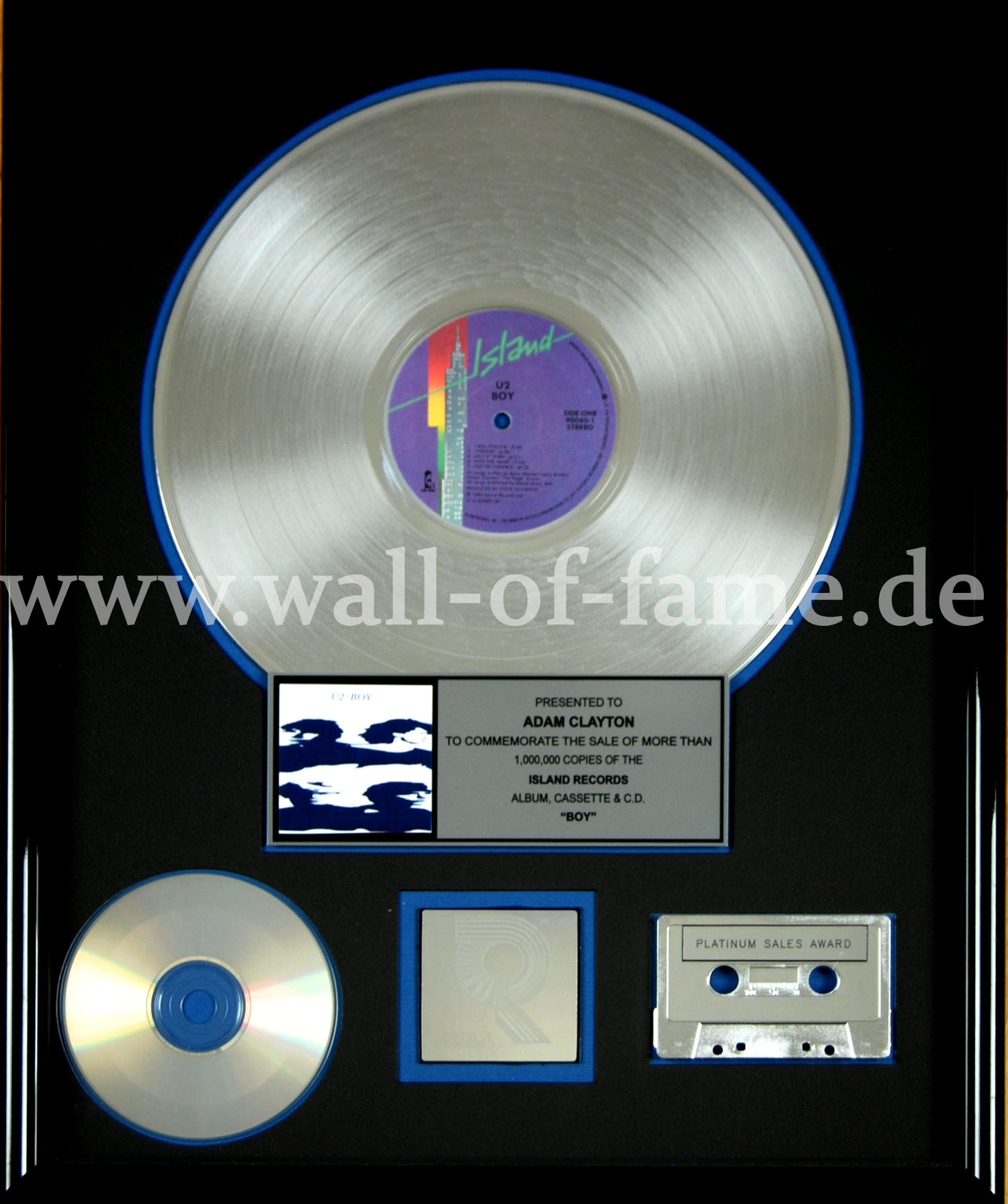 An RIAA “Platinum” record award presented to Adam Clayton to commemorate the sale of more than 1 million copies of the Island Records album Boy in the United States. EUR 1350,-