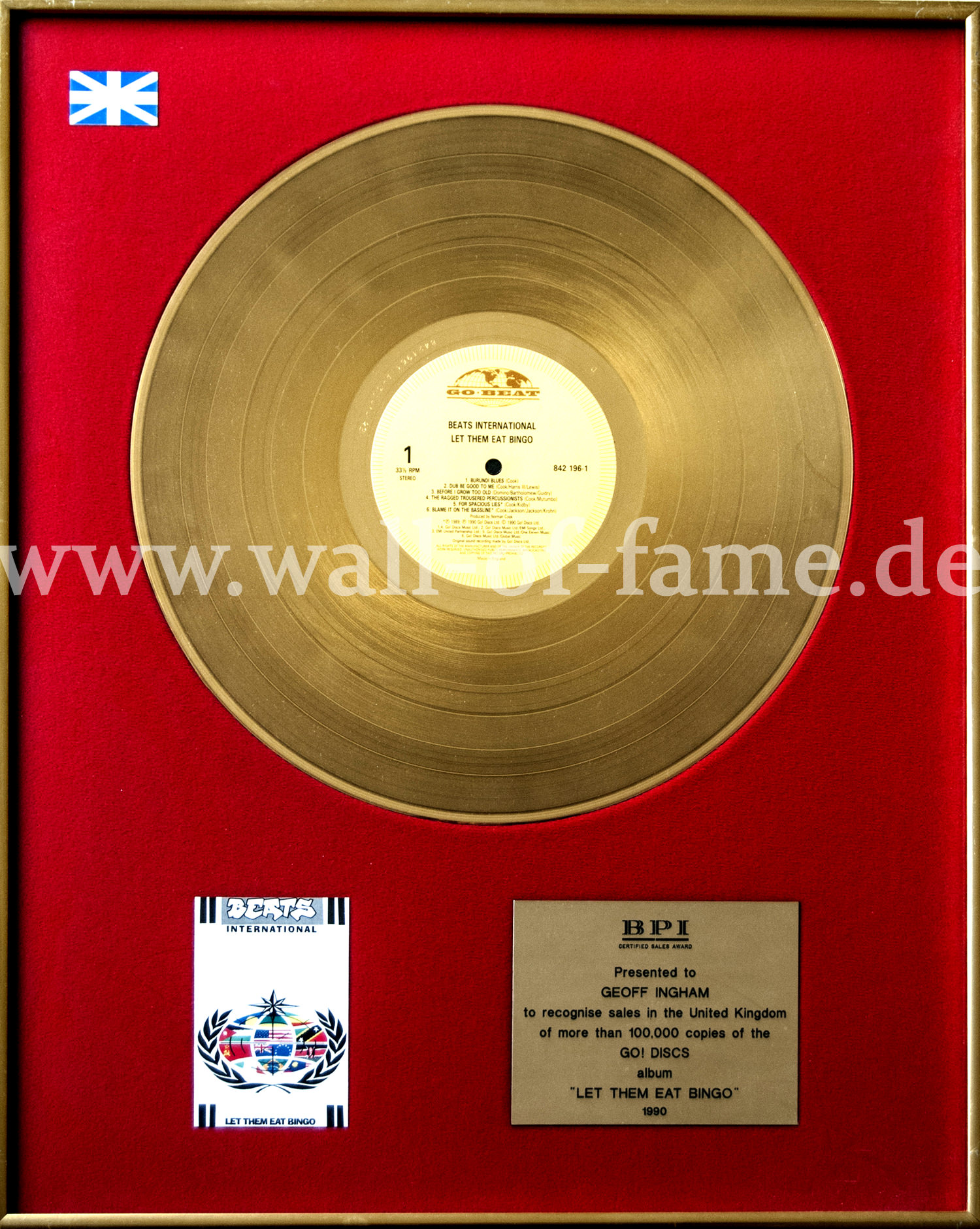 Gold Award, verliehen an Geoff Ingham für 100.000 verkaufter LP´s des Go Discs! Albums Let Them Eat Bingo in Großbritannien. EUR 290,-