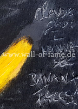Original Ölgemälde „Banana Smile“ von Krokus Bassist Chris von Rohr. Wie viele seiner Kollegen ist Chris von Rohr bekannt für sein Talent für die Bildende Kunst. „Banana Smile“ zitiert den legendären Montreux Jazzfest Organisator Claude Nobs, der das Publikum aufforderte: „I Wanna See Banana Faces“, 60 x 50 cm. EUR 2900,-