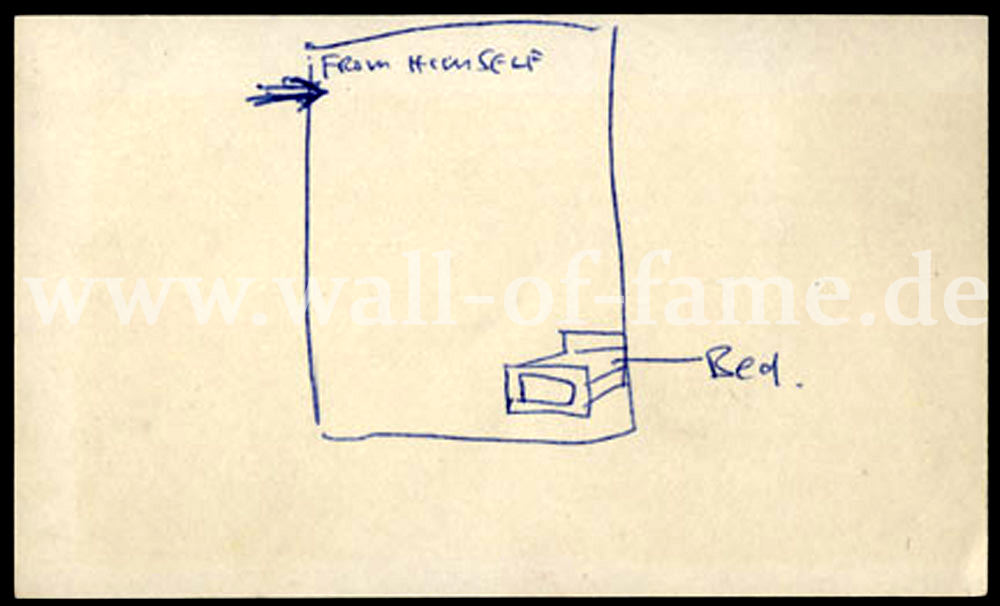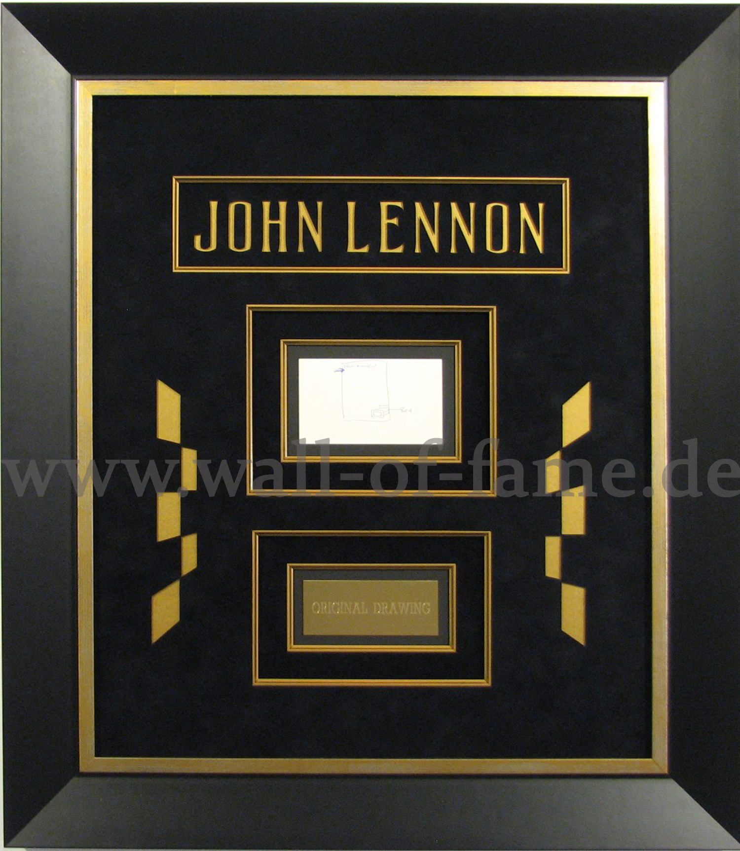 John Lennon Zeichnung mit blauem Kugelschreiber. Dargestellt ist ein Bett in einem Raum mit der Anmerkung „From Himself“, luxuriös gerahmt, 75×67 cm, EUR 2050,-