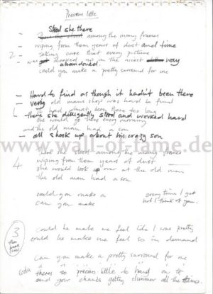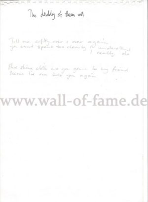 Handgeschriebener Songttext „Precious Little“ und „The Daddy Of Them All“ auf der Rückseite mit schwarzer Tinte. Es handelt sich um Original Working Lyrics. Handgeschriebene Songtexte sind besonders begehrt bei Sammlern. EUR 1150,-