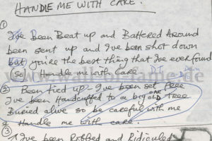 The Traveling Wilburys by Genesis Publications, Deluxe Edition. Die Wilburys erzählen ihre Geschichte in ihren eigenen Worten, dazu hunderte unveröffentlichter Fotos, Zeichnungen, privater Protokolle und handgeschriebener Songtexte. Nur die Deluxe Edition (Nummern 1 – 350) enthält zusätzlich einen edlen Fotodruck der Wilburys von Alberto Tolot mit geprägten Signaturen der Wilburys. Das sehr schön gebundene Buch ist handsigniert von Jeff Lynne, enthält einen Facsimile Text des handgeschriebenen Textes Handle With Care von George Harrison. Die Deluxe Edition ist aufbewahrt in einem handgefertigten Koffer, der für die reguläre Collector´s Edition nicht erhältlich ist. EUR 1850,-